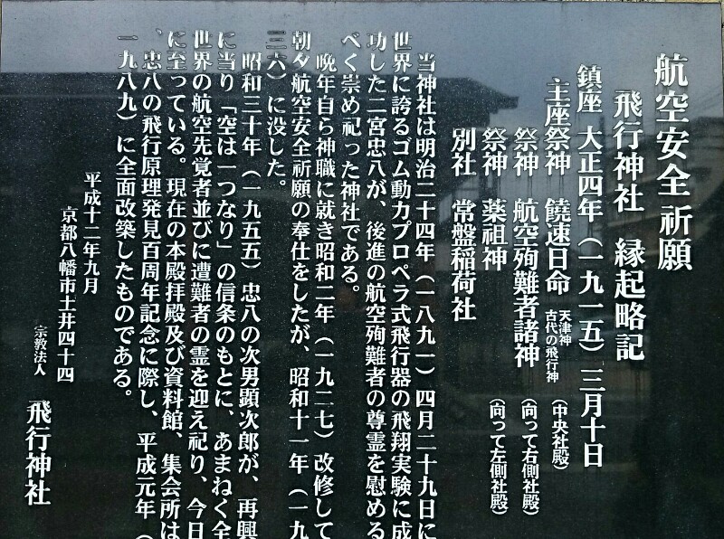 1891年(明治24年)に日本で初めて動力つき模型飛行実験に成功したものの、人を乗せることができる飛行機をライト兄弟が実現したことを知り、飛行機開発から離れる。しかし、飛行機発明以来、航空事故が多発するようになったことに心を痛めた忠八は、事故犠牲者の慰霊が飛行機開発に携わった者としての責任だと感じ、私財を投じて犠牲者の霊を祀る神社を1915年(大正4年)に創建した。安全祈願に訪れる航空、宇宙業界関係者が多い。