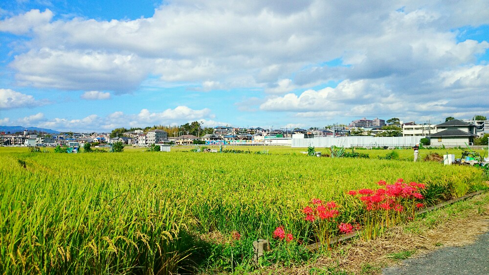 事実はともかくとして、彼岸花が咲くこの時期は涼しくなり虫の音が聞こえだす。稲が大きく育ち、夕焼けがとても美しい季節です。
