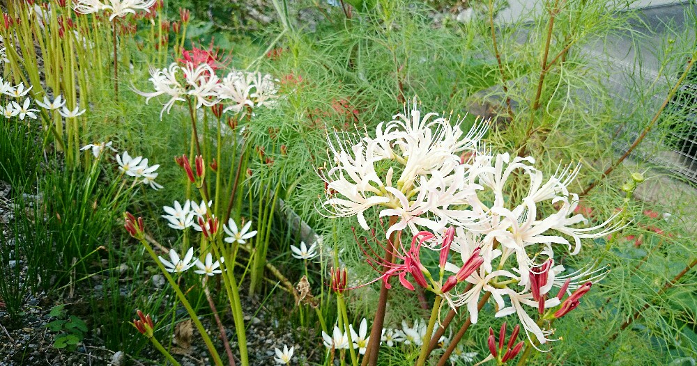 調べてみると白色の彼岸花は珍しいそうです。けっこう咲いていましたが……。