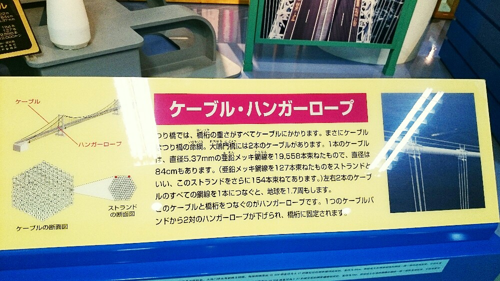 大鳴門橋を吊り上げるケーブル1本(横にのびるロープ)には、直系5.37mmの亜鉛メッキ鋼線という<錆びに強く、耐久性が高く、強度に優れたものを19558本を束ねて出来たものだそうです。