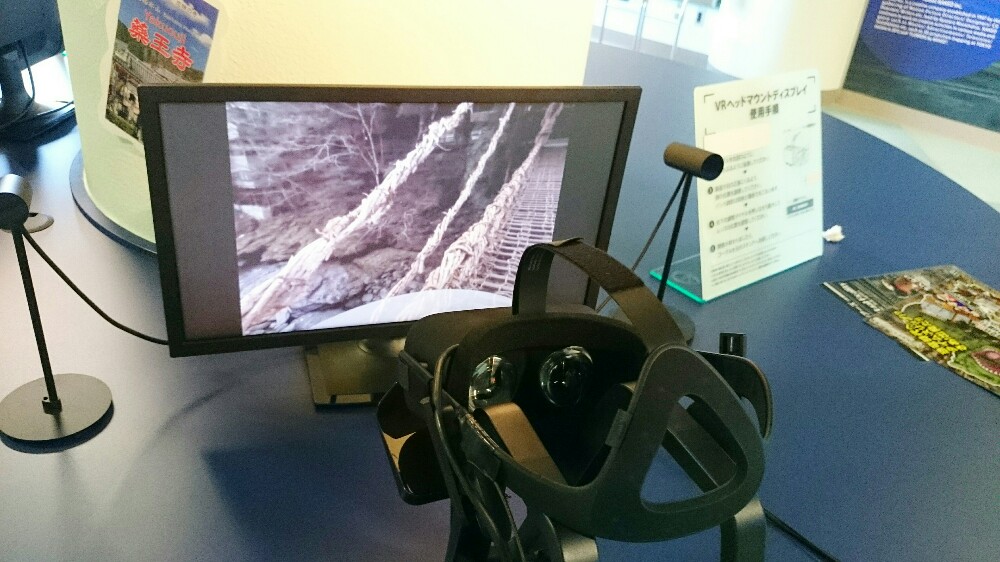 ヘッドギアにVRが取り付けられたもの。これを装着すると目の前に【祖谷かずら橋】が出現!