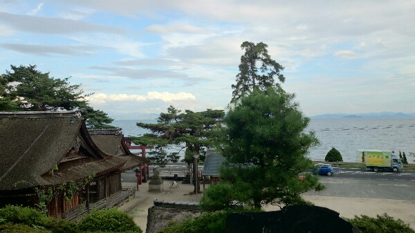 古い社殿に松の木、そして琵琶湖の見えるロケーション