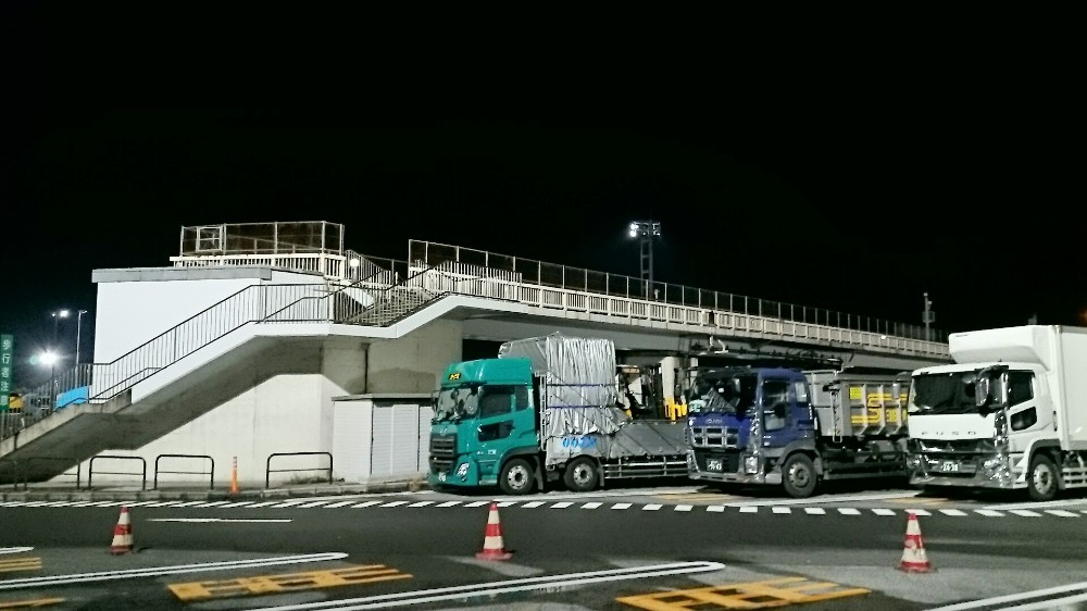 朝起きてホテルから出ると、そこには大好きなサービスエリアが広がっているというシチュエーション。目の前には沢山のトラックが止まっている。